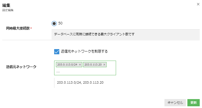 「送信元ネットワークを制限する」にチェックを入れ、IPアドレスまたはIPアドレス範囲を入力し、「更新」ボタンをクリックします。