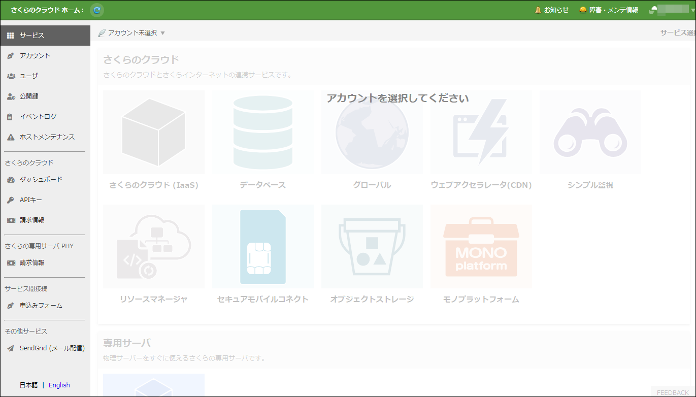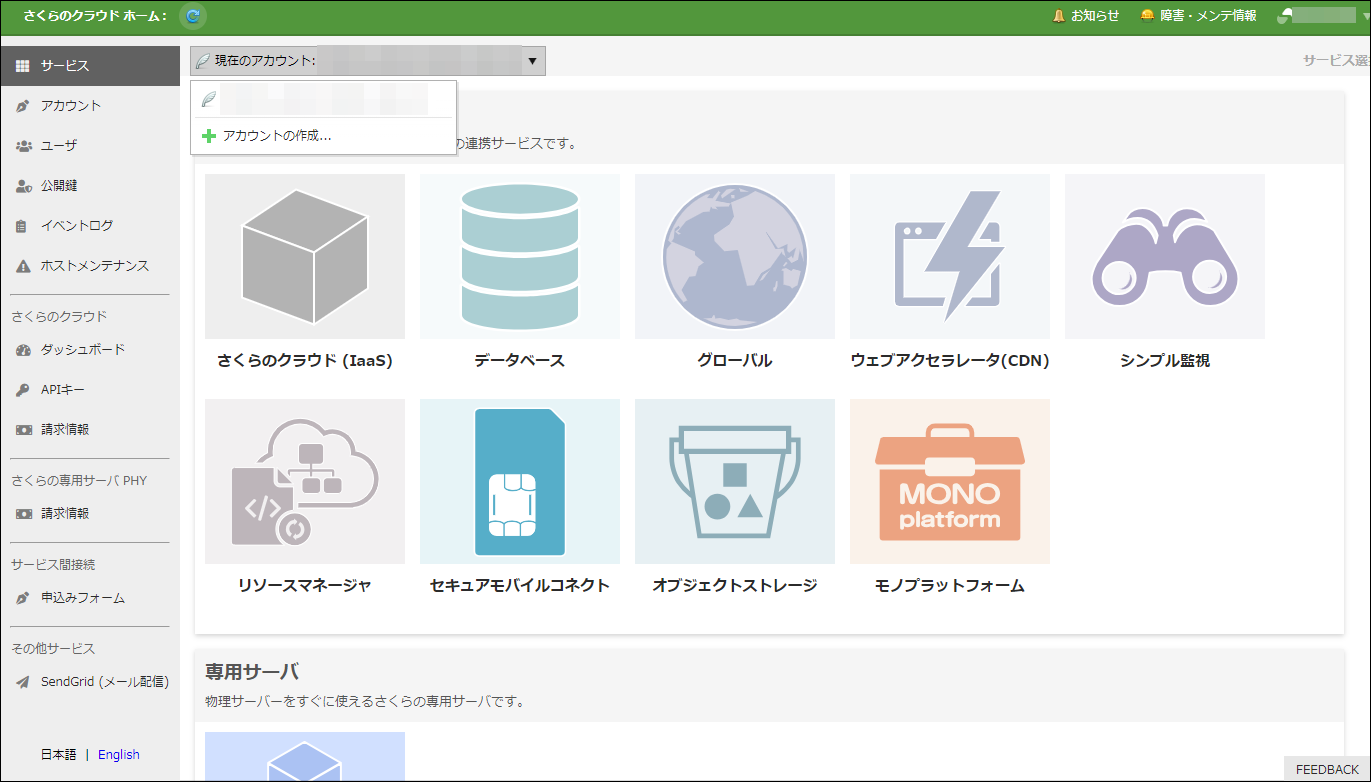 | さくらのクラウド(IaaS) | さくらのクラウドのコントロールパネルに移動します。 |