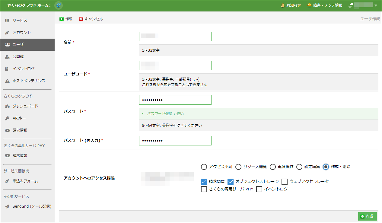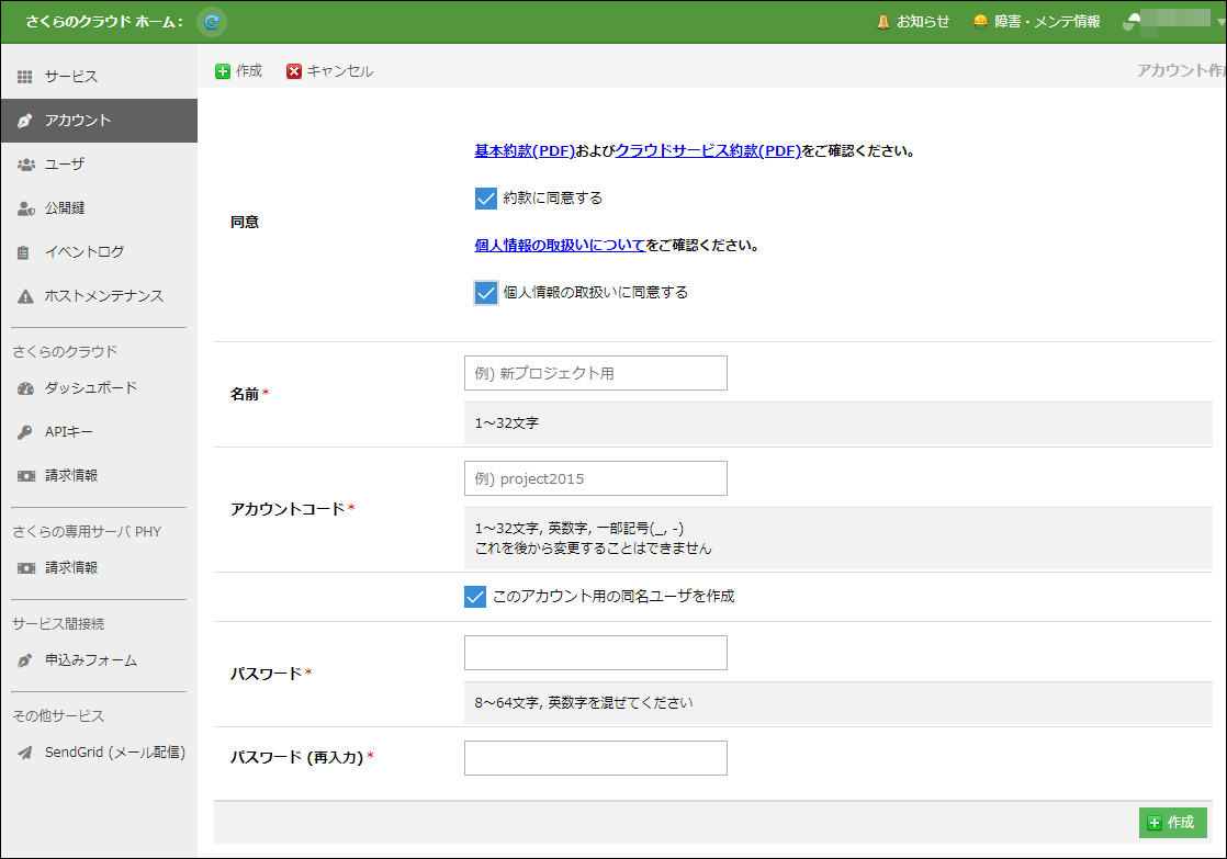 アカウント作成画面が表示されるので、各項目を入力します。入力後、画面の上部または下部に表示される「作成」ボタンをクリックすることで新たなアカウントが作成されます