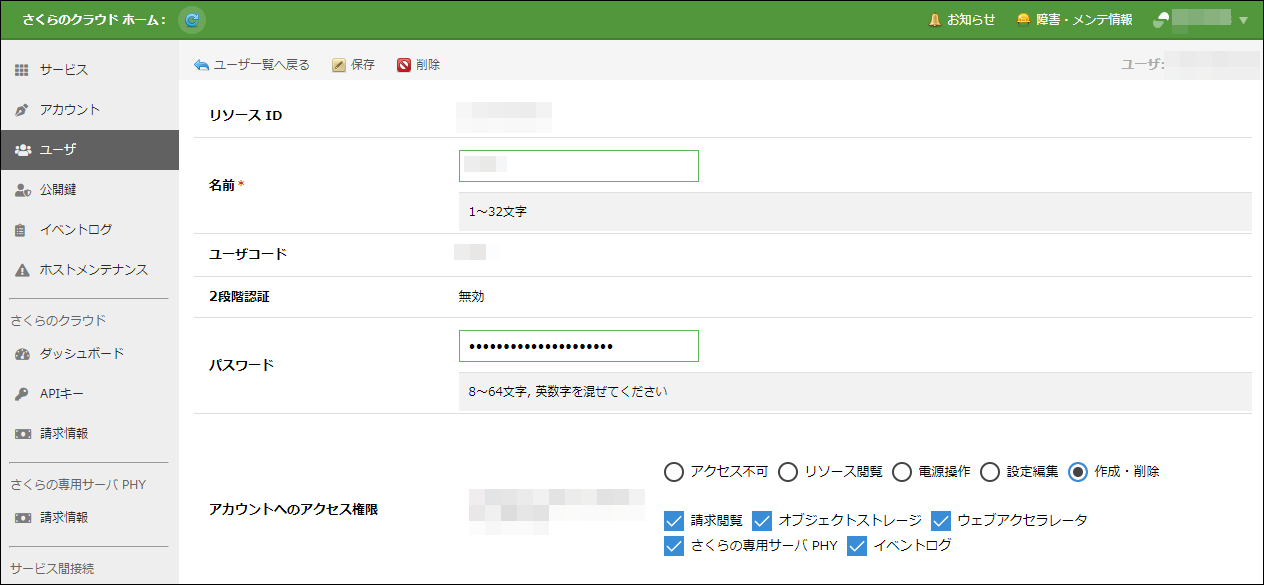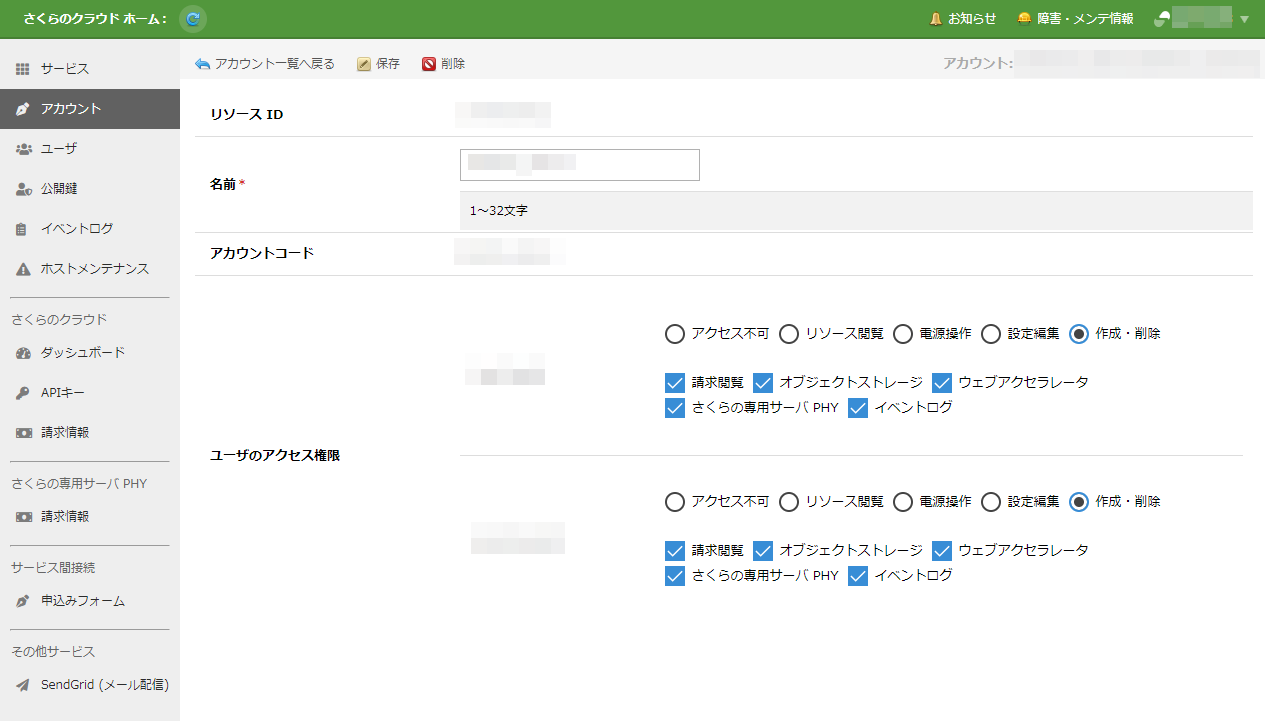 この機能により、会員IDごとにサービスへのログインが紐付くさくらのレンタルサーバなどの他のサービスと異なり、お客様が独自に作成可能な「ユーザ」と「アカウント」を使用して実際のリソース操作を行うことができます。