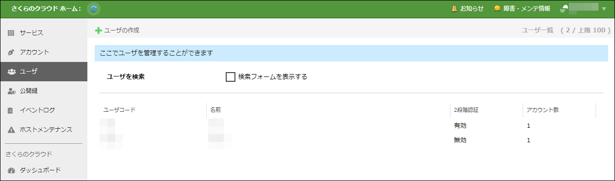 ユーザ管理画面では、ログイン中の会員ID内で作成済みのすべてのユーザが表示されます。