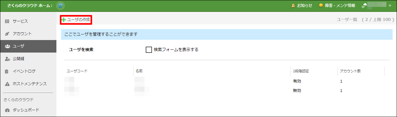新規にユーザを作成する場合は、左上の「ユーザの作成」ボタンをクリックします。