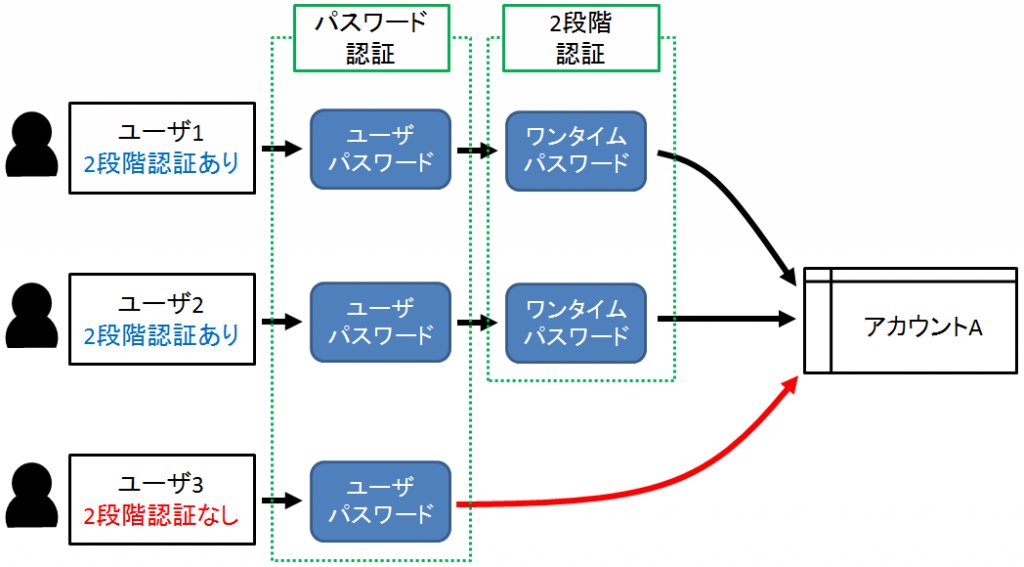 あるアカウントの操作が可能となるユーザが複数設定され、うち一部のユーザのみが2段階認証を設定済みの場合、2段階認証未設定のユーザを経由するログインにおいてセキュリティが弱くなります。そのため、すべてのユーザに2段階認証設定を行うことを推奨します。