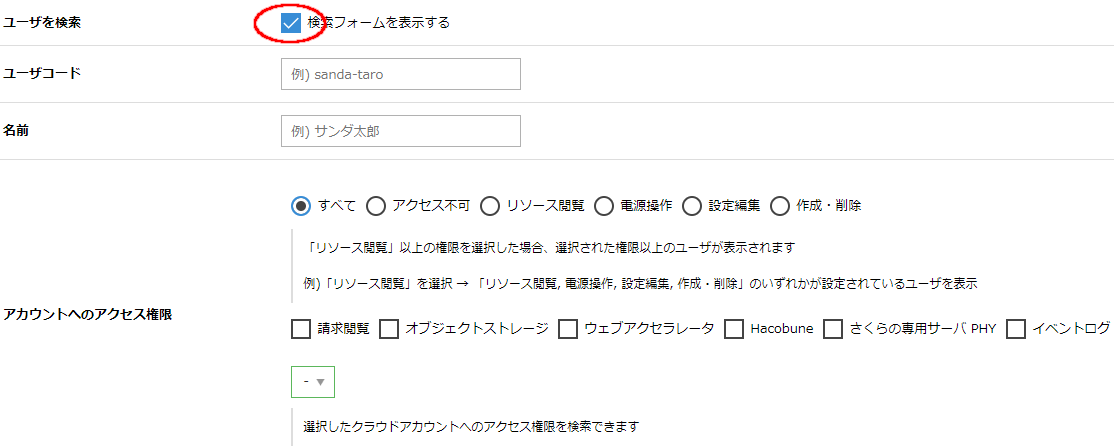 リスト画面上部に表示される「検索フォームを表示する」のチェックボックスを有効にすると、様々な条件で作成済みのユーザを検索可能なフォームが表示されます。大量のユーザを作成していたり、マッチする条件ごとにユーザを抽出したい場合に便利です。
