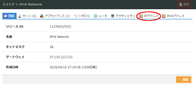 逆引きDNS登録したいIPアドレスを持つルータ+スイッチを選択し、「IPアドレス」タブをクリックします。