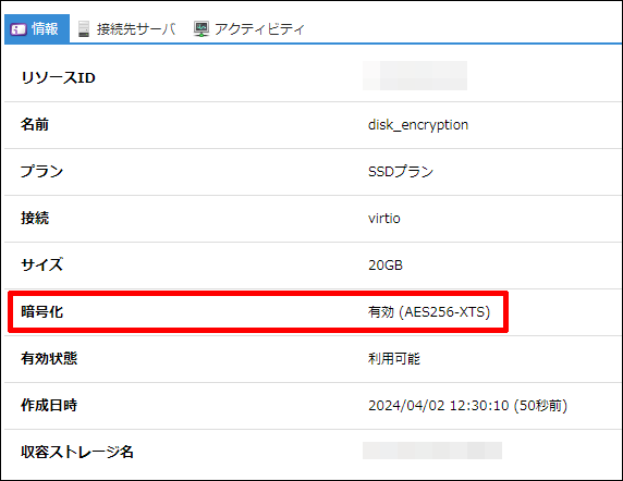 | 機能の有効/無効化タイミング | 有効化: ディスクの新規作成時 無効化: 不可 ※作成済みのディスクに対して暗号化を有効にしたり、利用途中で暗号化を無効化することはできません |