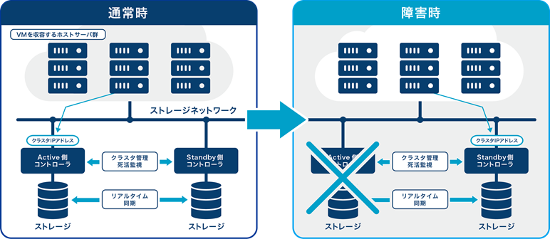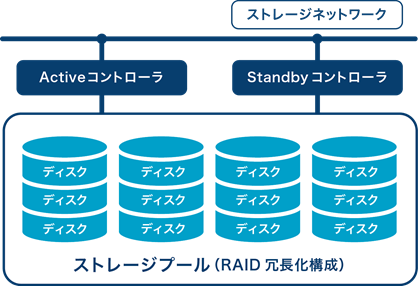 通常時はアクティブ側のコントローラでサービスを継続しますが、コントローラ異常が検知された場合は即座にスタンバイ側コントローラに切り替わります。
