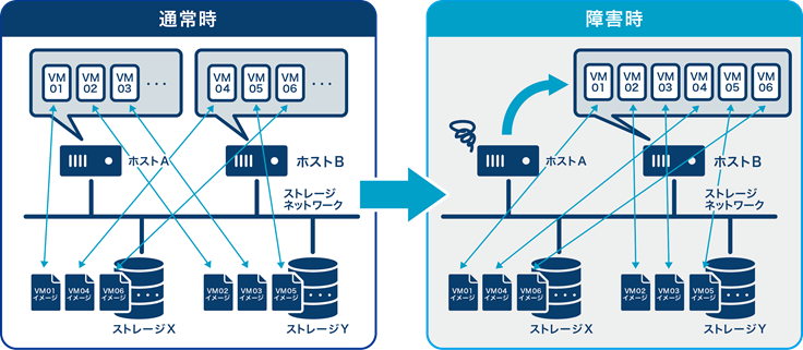 ホストサーバ側で起動されている仮想サーバに接続される仮想ディスクイメージは全てストレージ側に収容され、ストレージネットワークを介して読み書きされます。そのため、ホストサーバ側にはメモリ上の情報以外のデータは保持されません。
