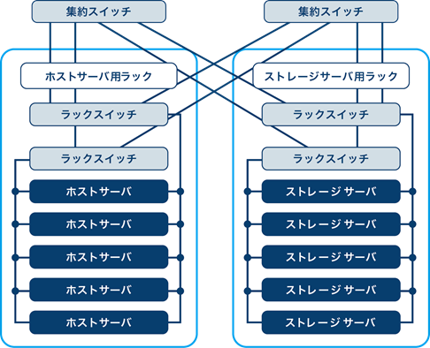 ストレージネットワークや、仮想サーバが外部と通信するネットワークなど、重要な経路はすべての回線・ネットワーク機器・インタフェース等が2重化されています。