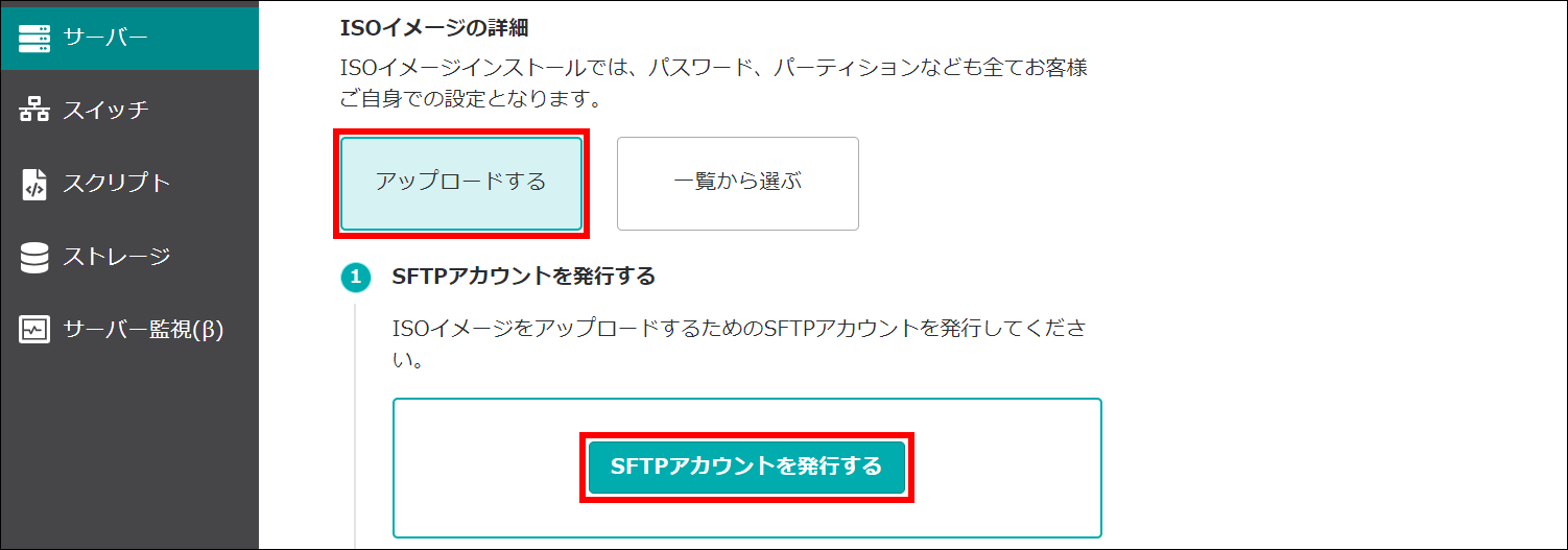 「アップロードする」を選択して「SFTPアカウントを発行する」をクリックします。