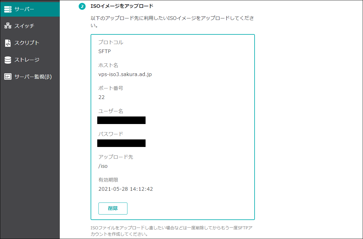 アップロードできるISOイメージは、1イメージのみです。新しくイメージをアップロード場合は、事前に古いイメージをコントロールパネルで削除してください。