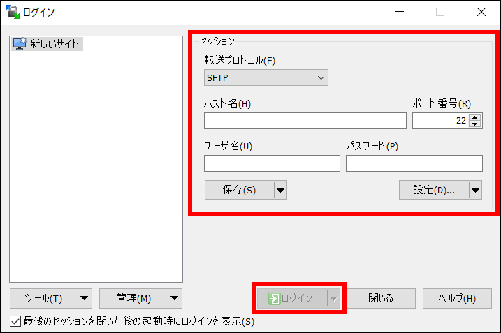 発行したSFTPアカウントの情報を、「セッション」の各項目に入力して「ログイン」をクリックします。
