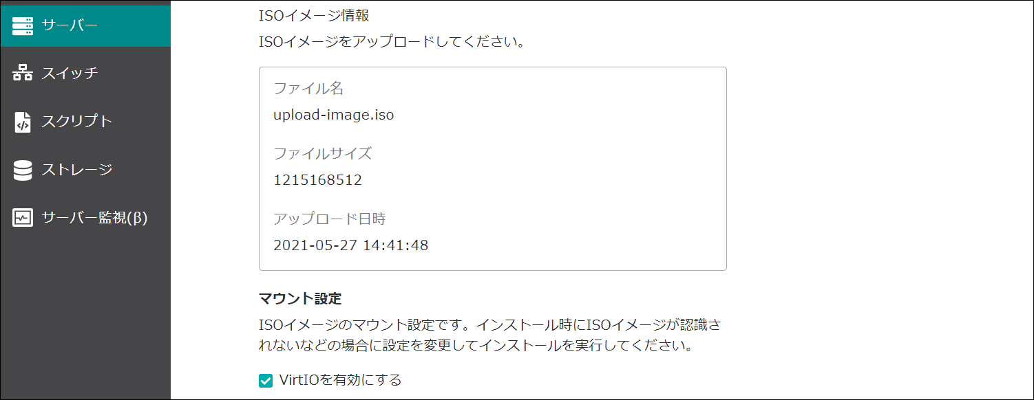 アップロードしたデータは「ISOイメージ情報」に表示されます。