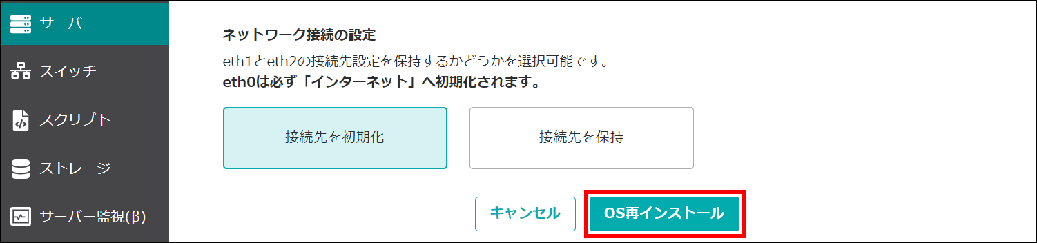 「ネットワーク接続の設定」で、eth1以降のネットワーク接続を初期化するか選択します(V3/V4/V5バージョン)。