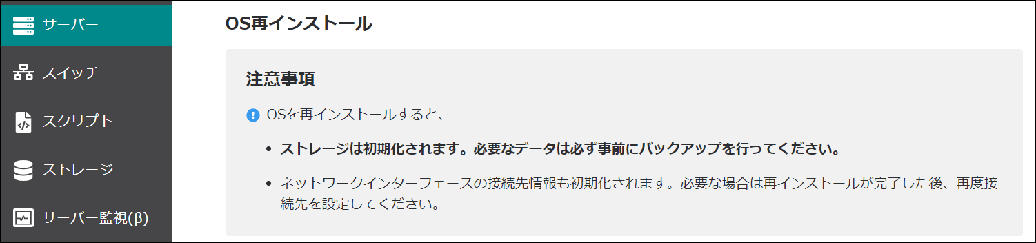 「OS再インストール」をクリックして、表示された内容に問題がなければもう一度「OS再インストール」をクリックします。
