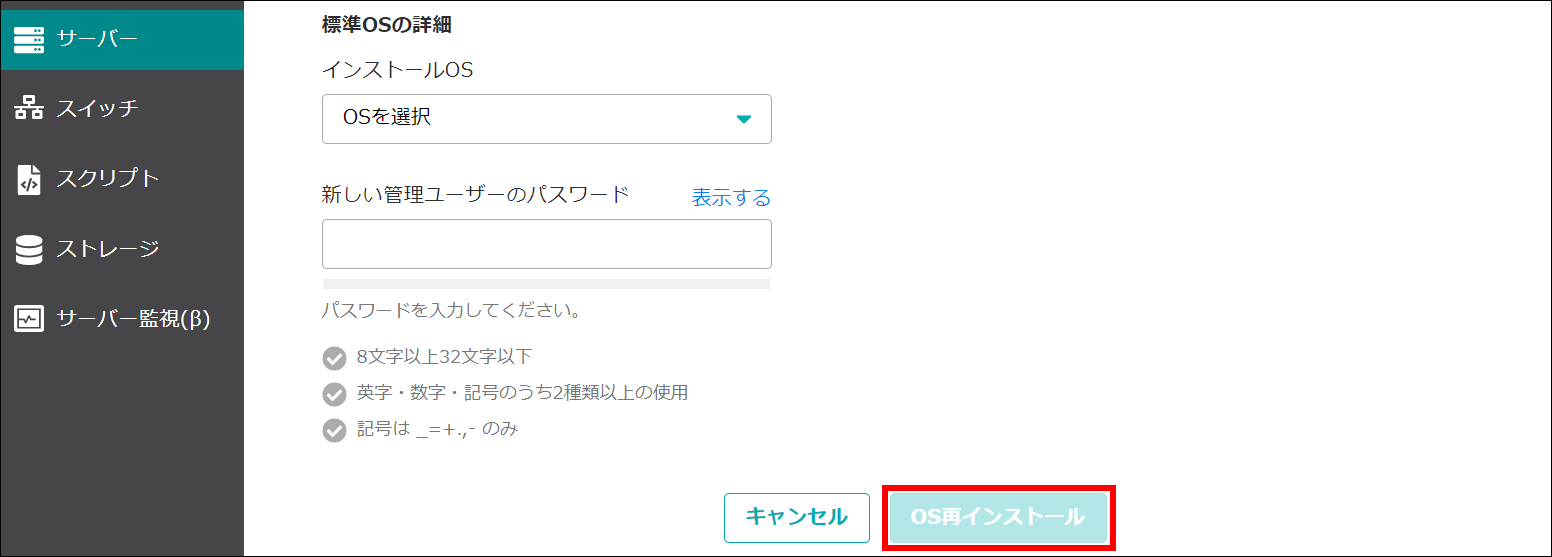 「OSを選択」からインストールするOSを選択して「新しい管理ユーザのパスワード」を入力します。