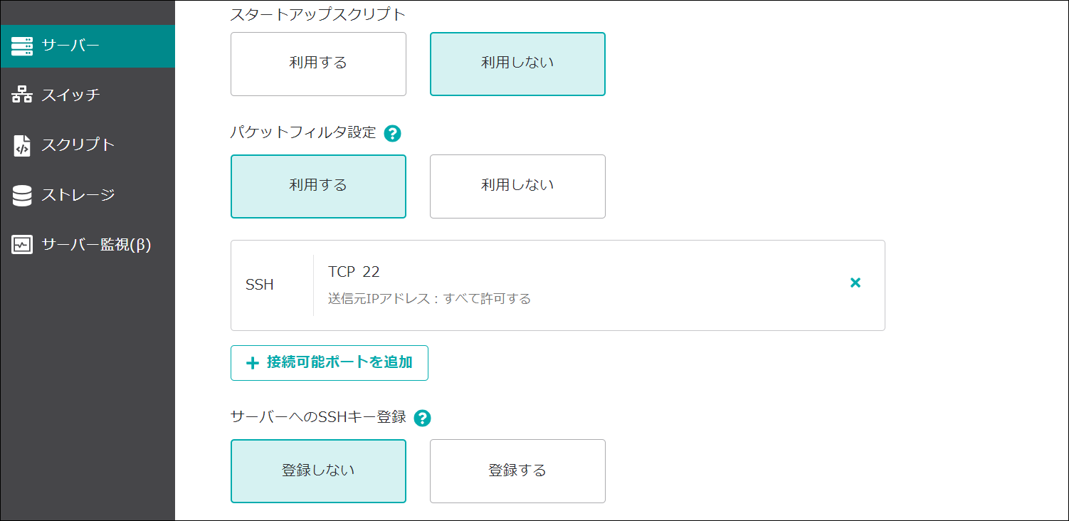 「スタートアップスクリプト」「パケットフィルタ設定」「サーバーへのSSHキー登録」は適宜ご利用ください。