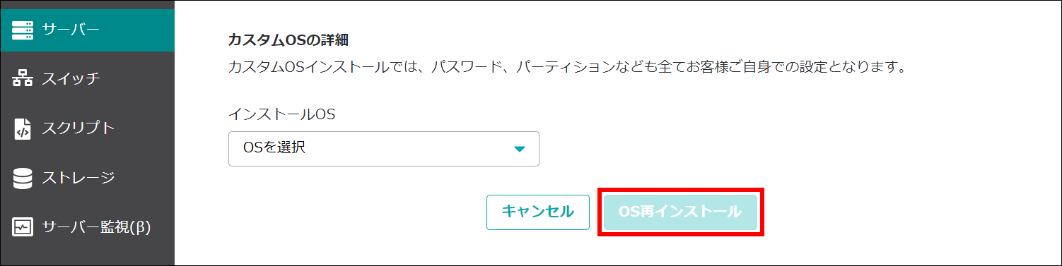 「OSを選択」からインストールするOSを選択して「OS再インストール」をクリックします。