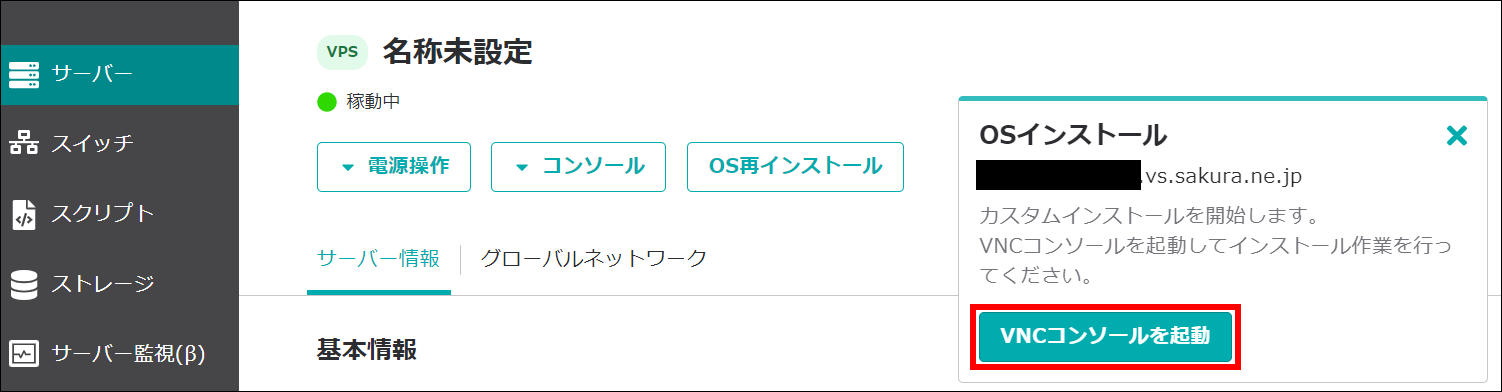 「VNCコンソールを起動」をクリックし、OSインストール作業を行ってください。