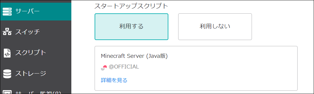スタートアップスクリプトで「利用する」を選択し、「Minecraft Server(Java版)」を選択します。
