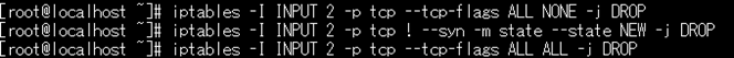 # iptables -I INPUT 2 -p tcp ! –syn -m state –state NEW -j DROP ——②