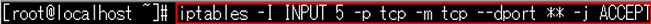 # iptables -I INPUT 5 -p tcp -m tcp –dport ** -j ACCEPT