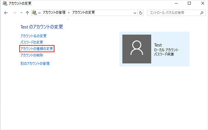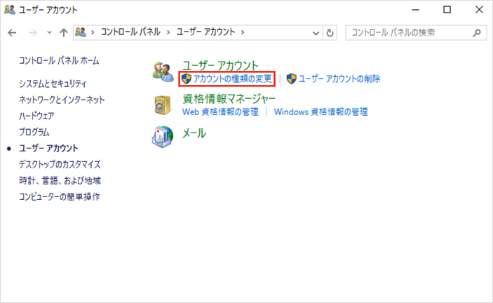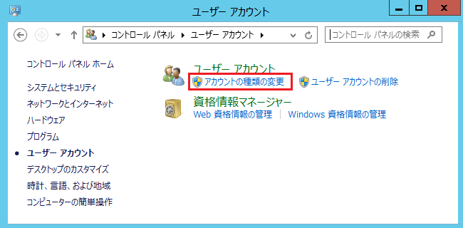 「ユーザーアカウント」メニューの中にある「アカウント種類の変更」をクリックします。