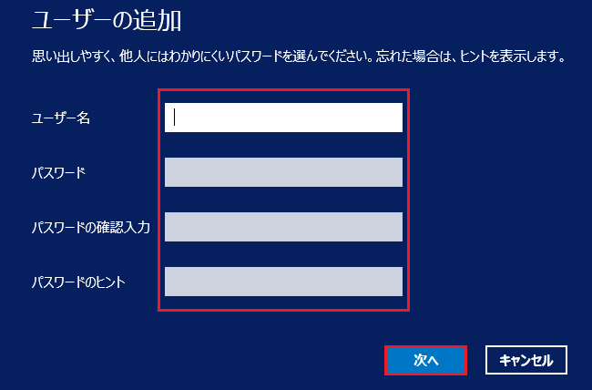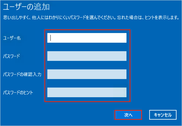 追加するユーザーの「ユーザー名」「パスワード」と必要に応じて「パスワードのヒント」を入力し、「次へ」をクリックします。
