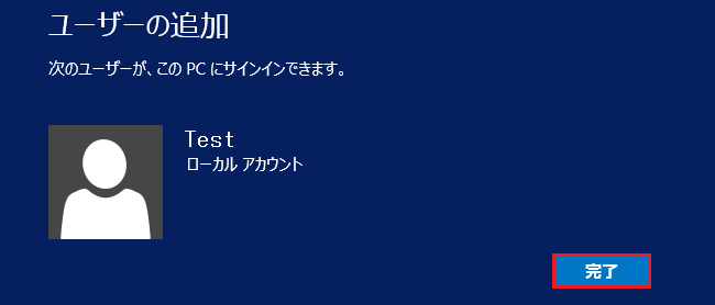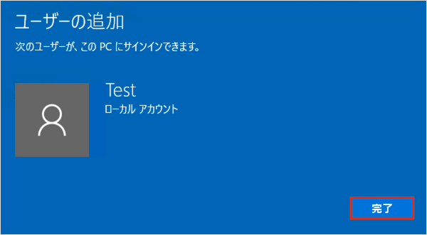 新しいユーザーアカウントが作成されたら「完了」をクリックします。