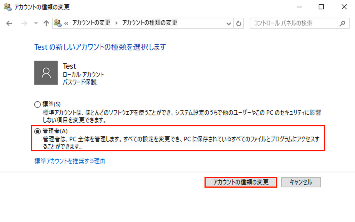 「管理者」を選択し、「アカウントの種類の変更」をクリックします。