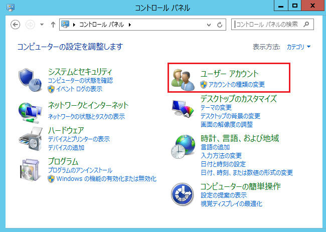 「コントロールパネル」メニューの中にある「ユーザーアカウント」をクリックします。