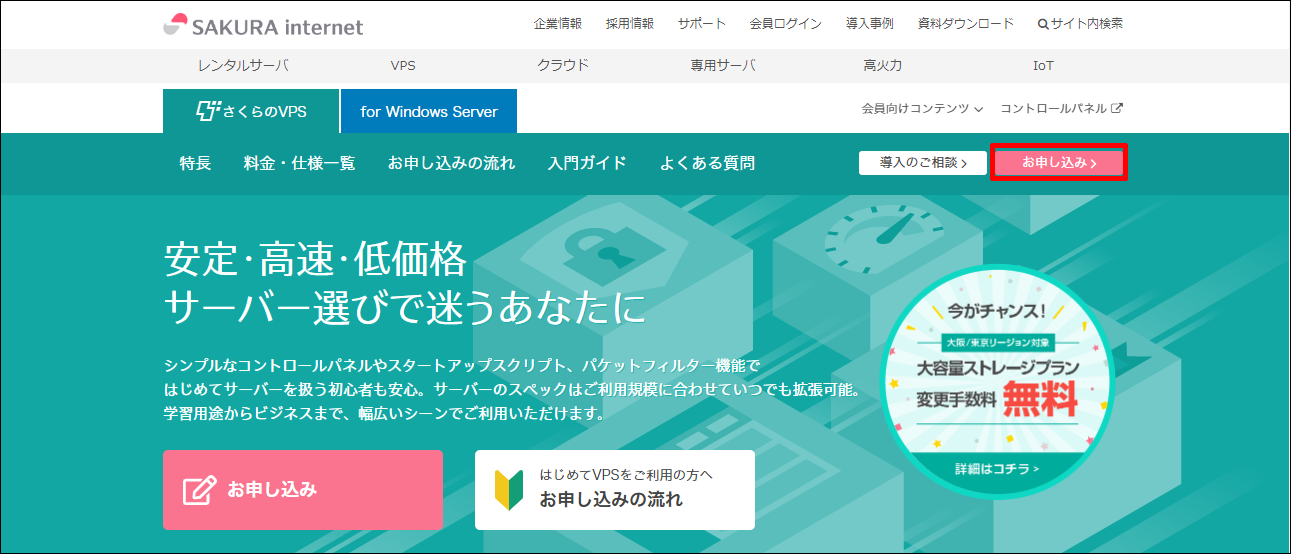 さくらのVPS for Windows Server の右上にある「お申込み」をクリックします。