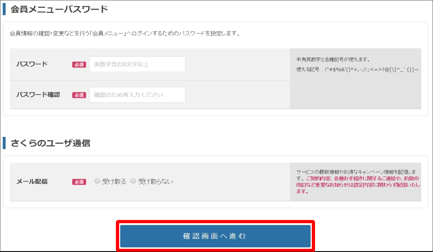 会員メニューにアクセスするためのパスワードを入力し、メール配信可否を選択して「確認画面へ進む」をクリックします。