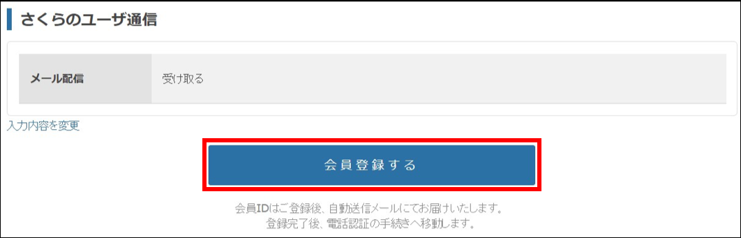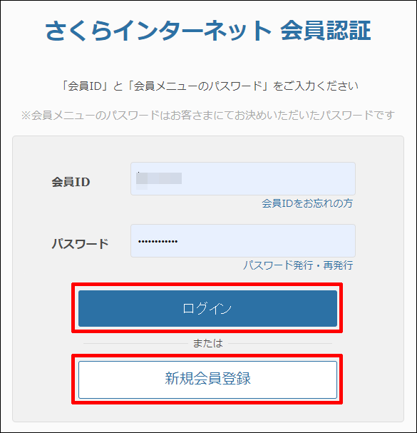 新たに会員IDを取得される方は「新規会員登録へ進む」を、さくらの会員IDをお持ちの方は「ログイン画面へ進む」をクリックします。