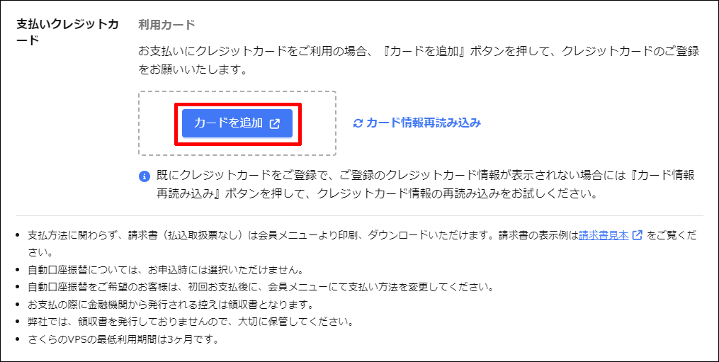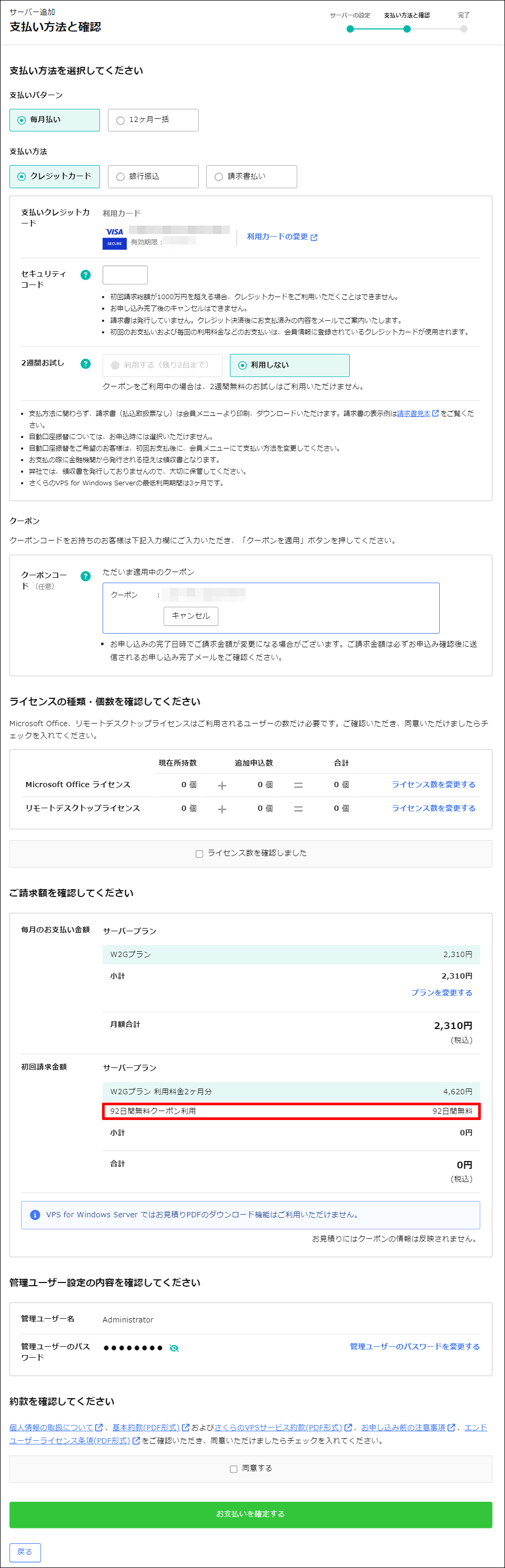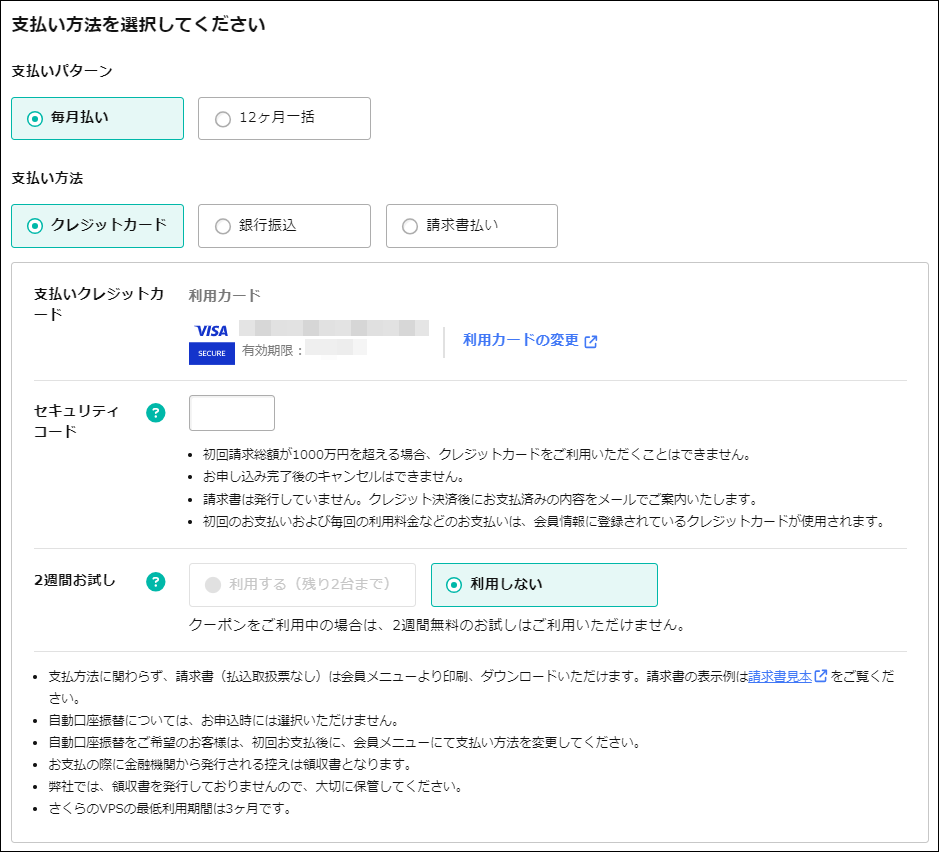 「支払期間」と「支払方法」を選択します。支払方法がクレジットカードの場合は、クレジットカード情報を入力してください。