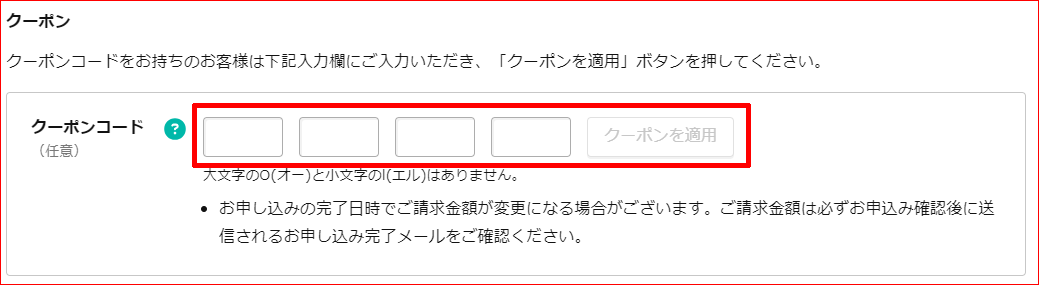 クーポンコードを入力して、「お申し込み内容の確認」をクリックします。