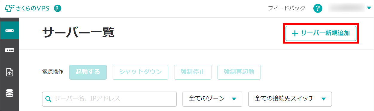 コントロールパネル にログインし、「サーバー一覧」から「サーバー新規追加」をクリックします。