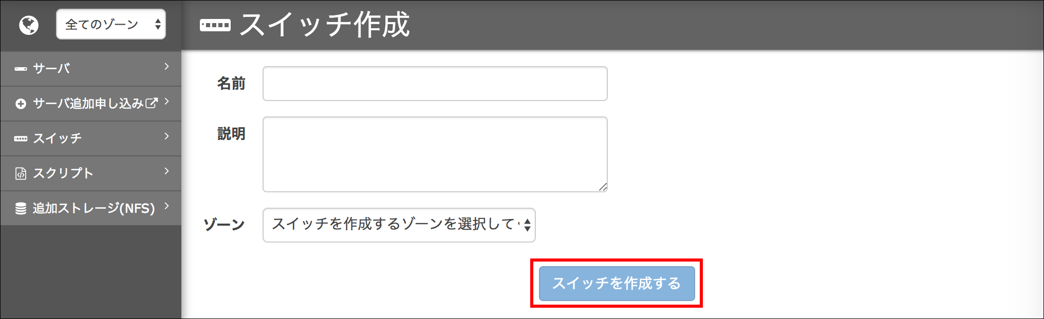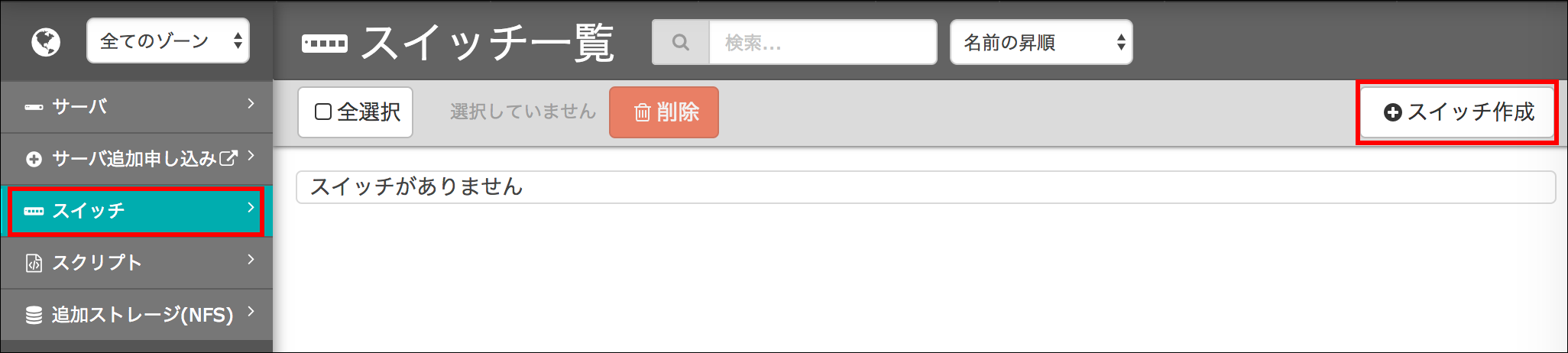 さくらのVPSのコントロールパネルにログインし、「スイッチ」を選択します。その後、「スイッチ作成」をクリックします。
