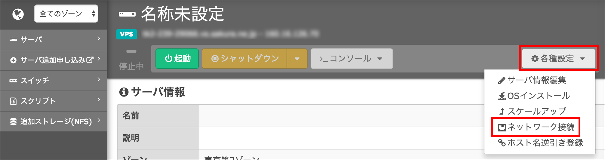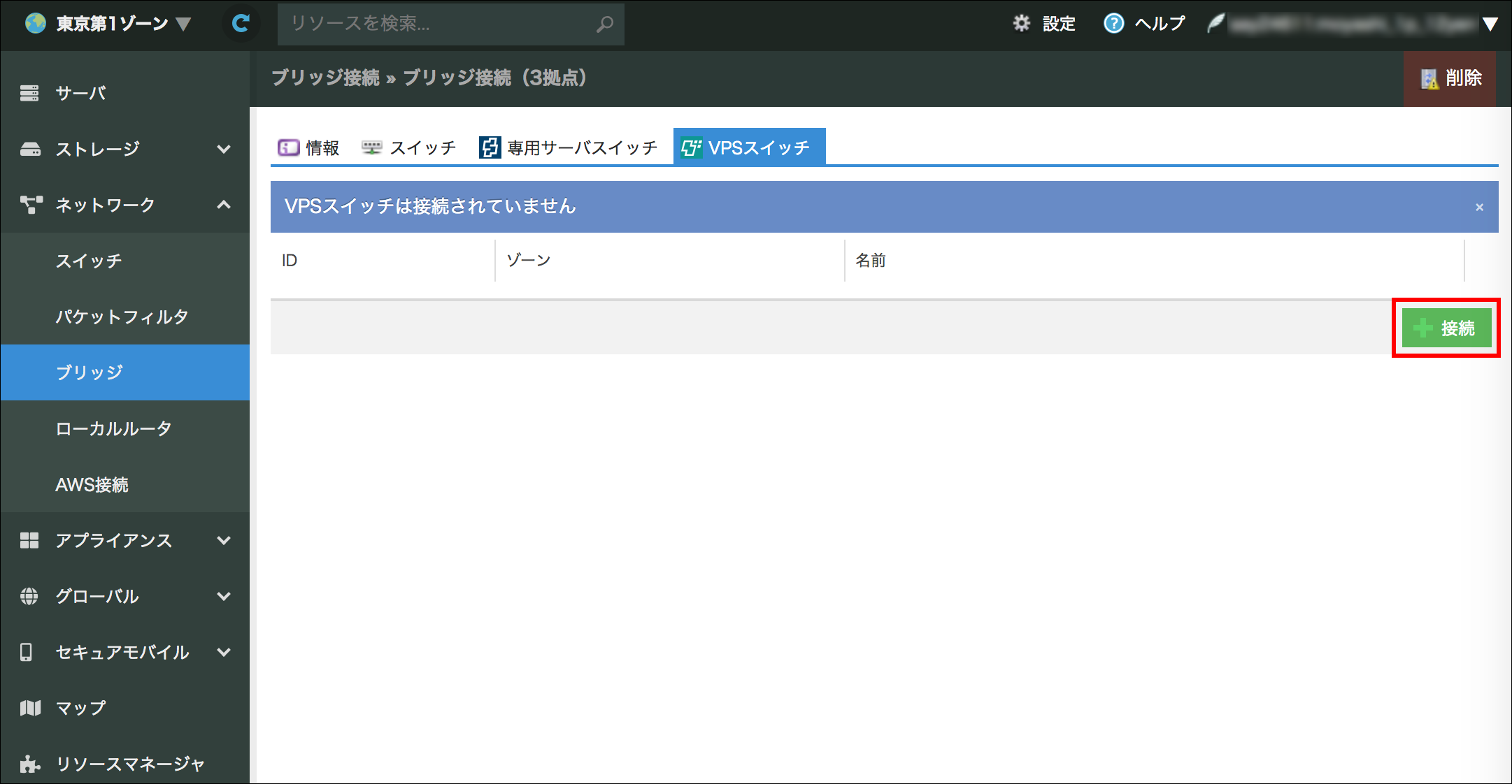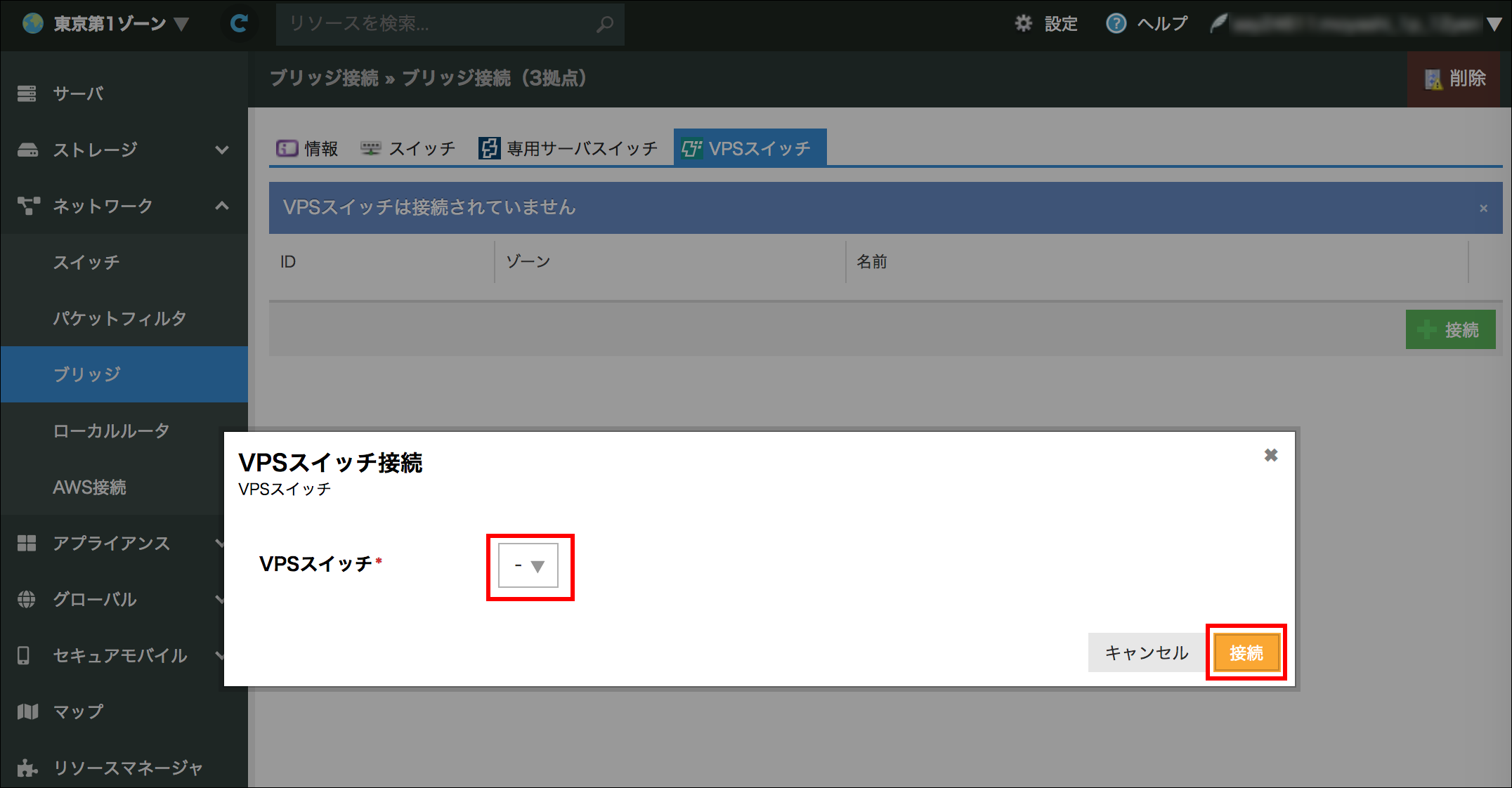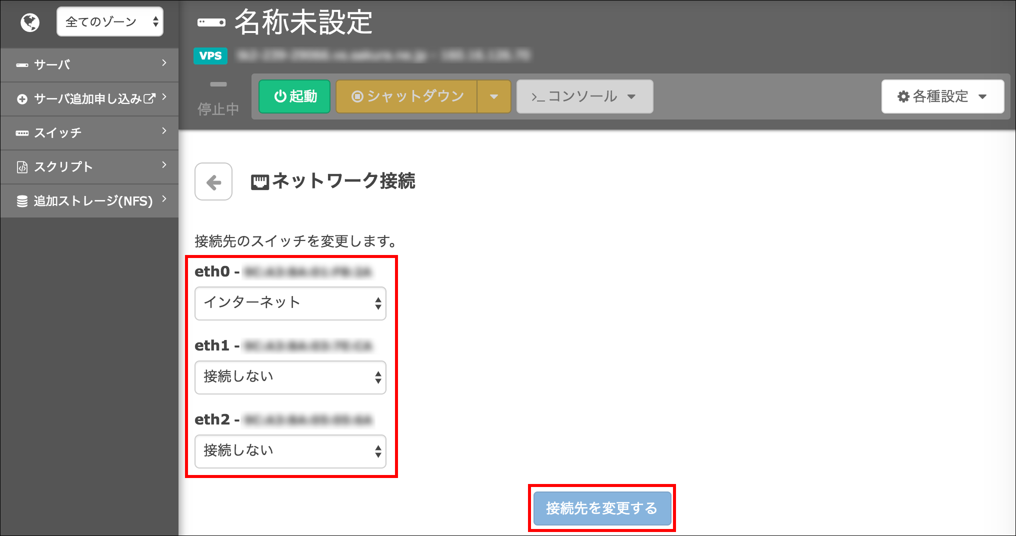 VPS側のスイッチを「-▼」から選択して、「接続」をクリックします。