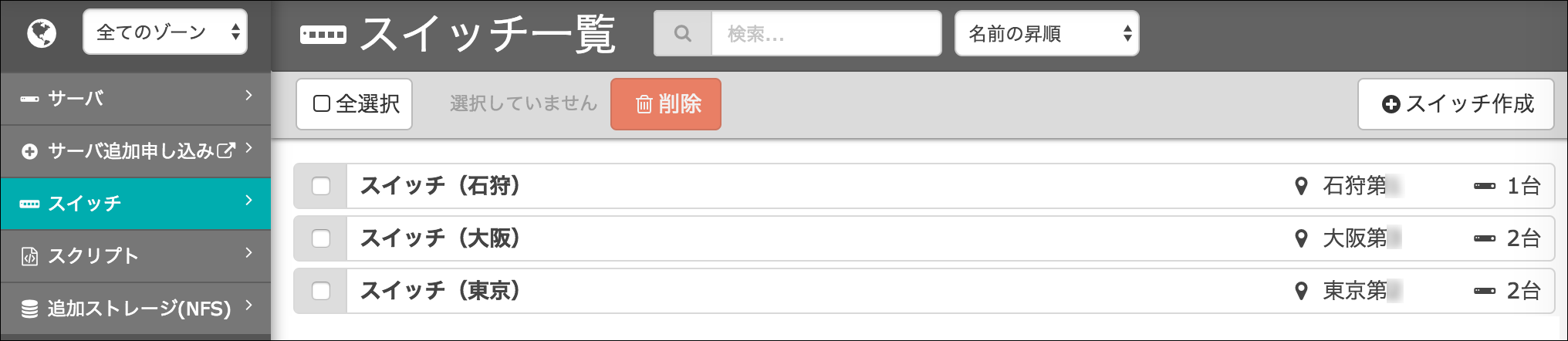 東京 / 大阪 / 石狩の対象サーバをすべてスイッチに接続してください。