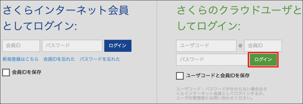 さくらのクラウドのログイン画面から「さくらのクラウドユーザとしてログイン」します。