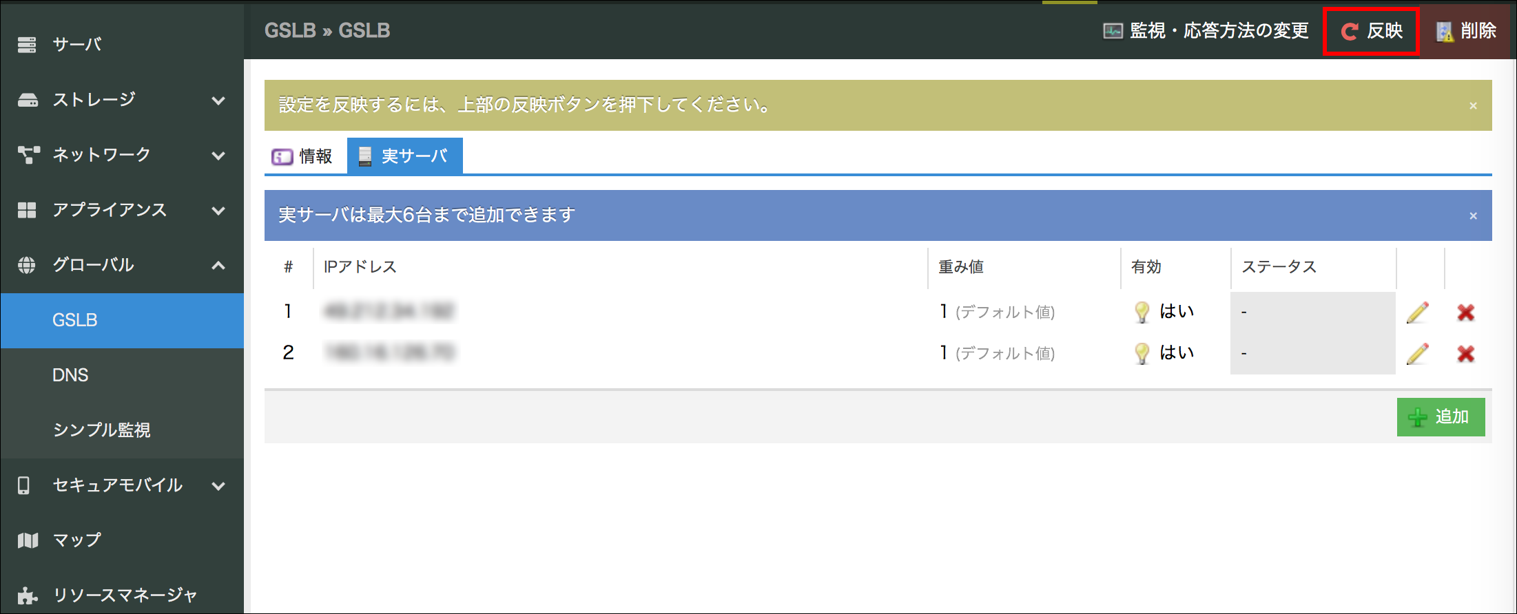 操作確認の画面で「はい」をクリックします。この操作によってGSLBアプライアンス側へ設定が反映されます。