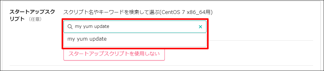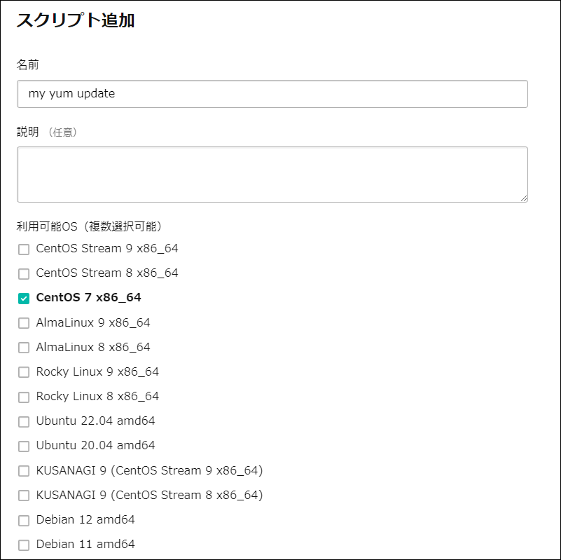 スクリプトの名前を入力します。ここでは「my yum update」としています。利用可能OSは「CentOS7 x86_64」と「CentOS8 x86_64」を選択します。