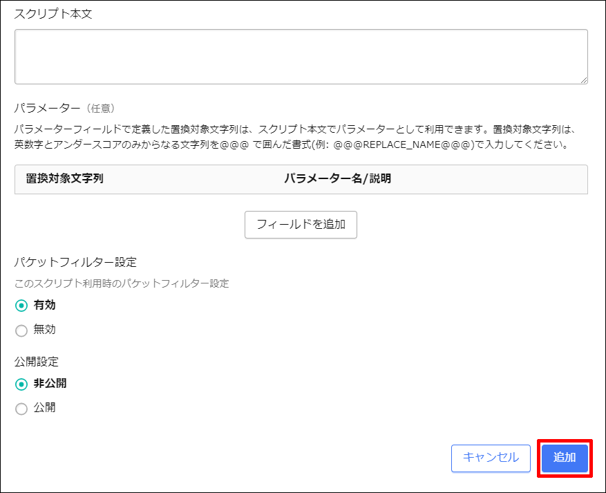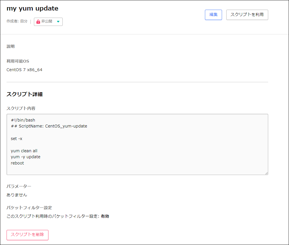[スクリプト本文]に、先ほど紹介したyum updateのスクリプト全文をコピーして貼り付けます。