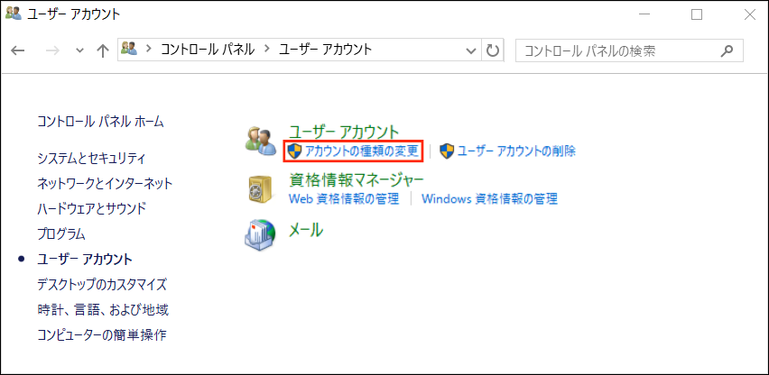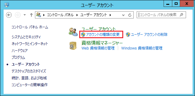 「ユーザーアカウント」メニューの中にある「アカウントの種類の変更」をクリックします。