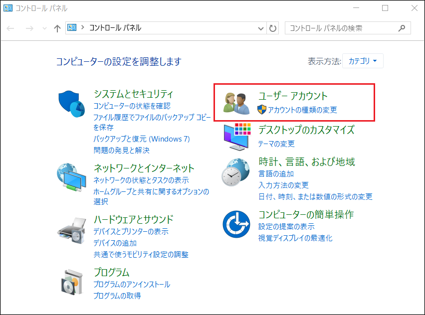 「コントロールパネル」メニューの中にある「ユーザーアカウント」をクリックします。