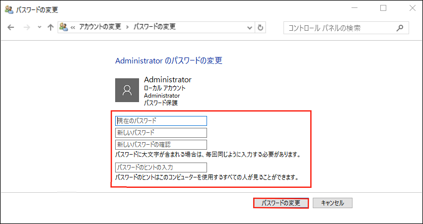 「現在のパスワード」「新しいパスワード」と必要に応じて「パスワードのヒント」を入力し、「パスワードの変更」をクリックします。