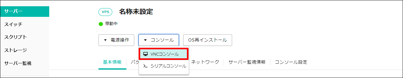 「コンソール」から「VNCコンソール」をクリックします。