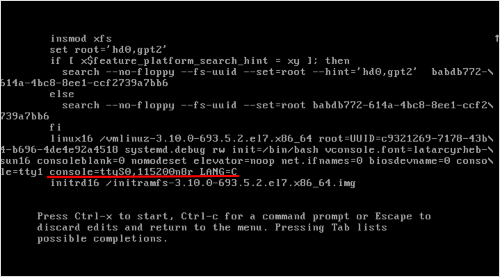 続いて「console=ttyS0,115200n8r LANG=C」の文字をバックスペースで削除します。