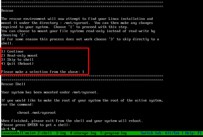 1:ローカルHDDをマウントして起動します。マウント後は「/mnt/sysroot」のディレクトリにデータが展開されています。ただしHDD内のデータやファイルシステム、パーティションが破損している場合は高確率で失敗します。